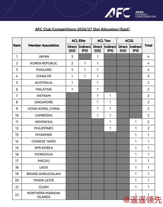 26/27赛季东亚区亚冠席位分布